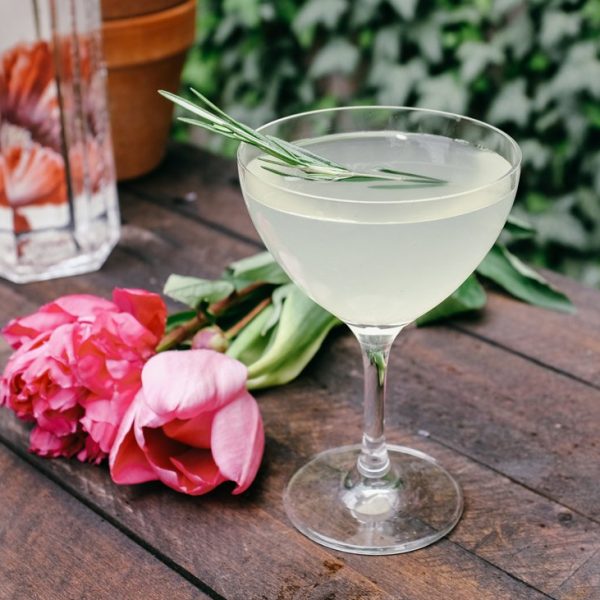 Build all the ingredients together over ice. Shake the ingredients for 30 seconds, strain into a coupe glass, and garnish with a rosemary sprig.
