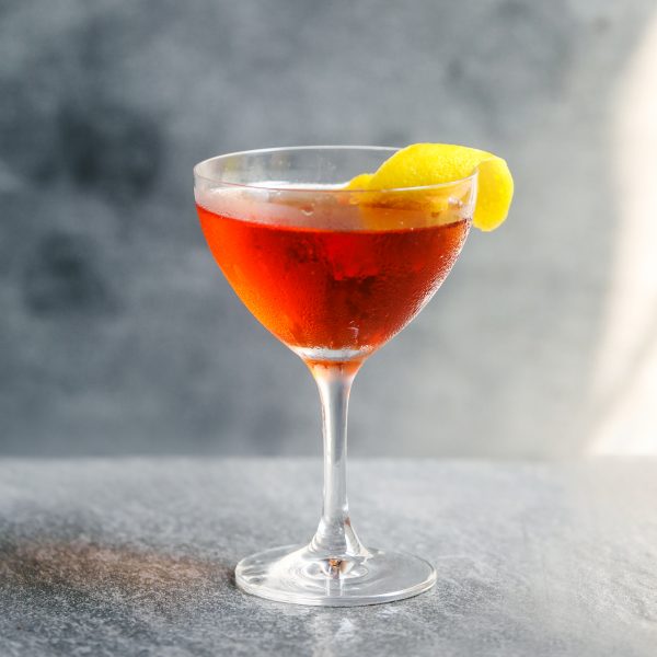 Add all ingredients to a mixing glass and stir until well chilled, decant into a chilled coupe or martini glass and serve with a brandied cherry, add an expressed lemon peel if desired