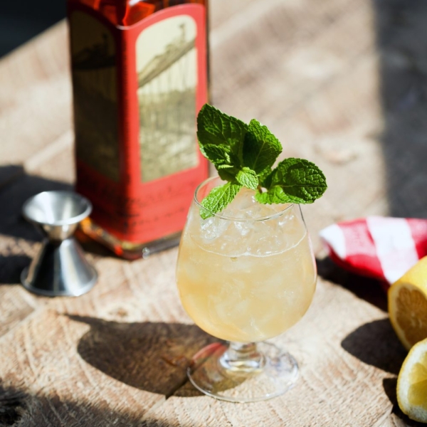 Muddle the lemon in a shaker, enough to release the juice inside without pulverizing the rind. Add remaining ingredients and fill with ice. Shake, and double-strain into a rocks glass filled with crushed ice. Slap a mint sprig to release the aroma and use as garnish.
